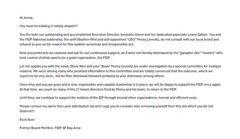 However, tensions appear significantly higher than the formal statement suggests. Ricki Alon, former board member from the FIDF San Francisco Bay Area chapter, sharply criticized recent leadership actions in a fiery email addressed to staff member Jenna Griffin. Alon lambasted the decision to terminate prominent executives Amarelle Green and Leane Zatlavi without proper local board consultation, calling Weil and Levovitz's actions "senseless and irresponsible."